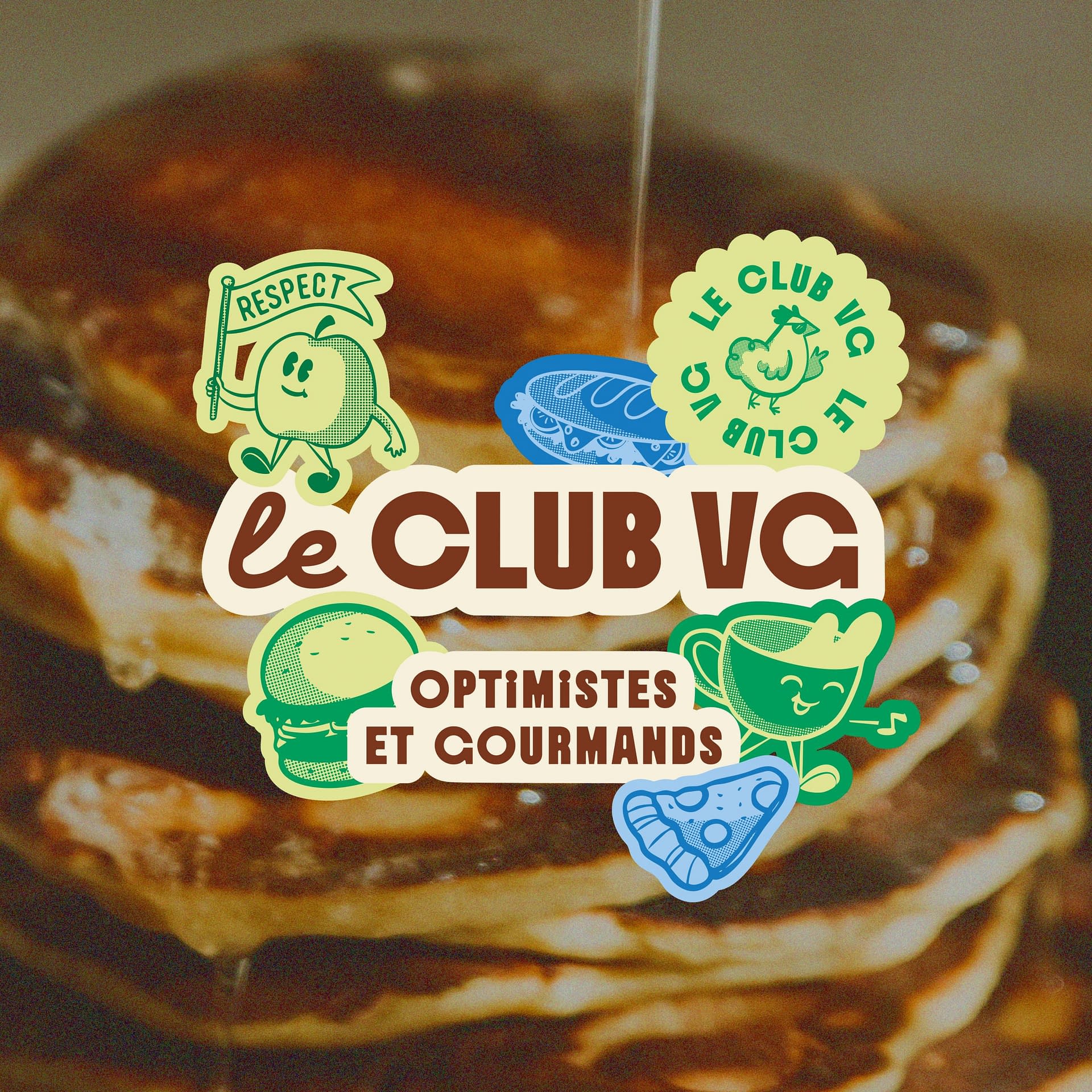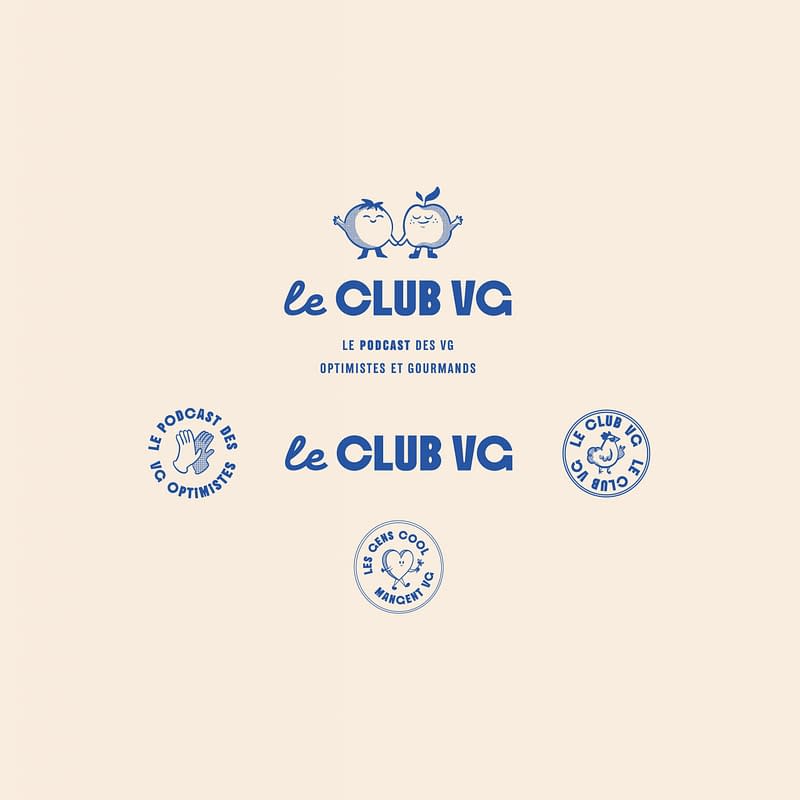 Pour représenter cette vision, je mise sur une inspiration années 90, pleine de petites mascottes qui viennent donner de la sympathie et un peu d’humour à l’identité visuelle. Elles se complètent, se regroupent et se superposent dans un joyeux chahut qui soutient l’idée d’un rassemblement, d’une joyeuse troupe d’amis. Ces illustrations sont déclinées sous la forme de badges, comme une façon d’afficher son appartenance au Club VG. Les typographies sont rondes et gourmandes, toujours pour accompagner la vision du podcast.
