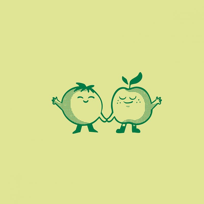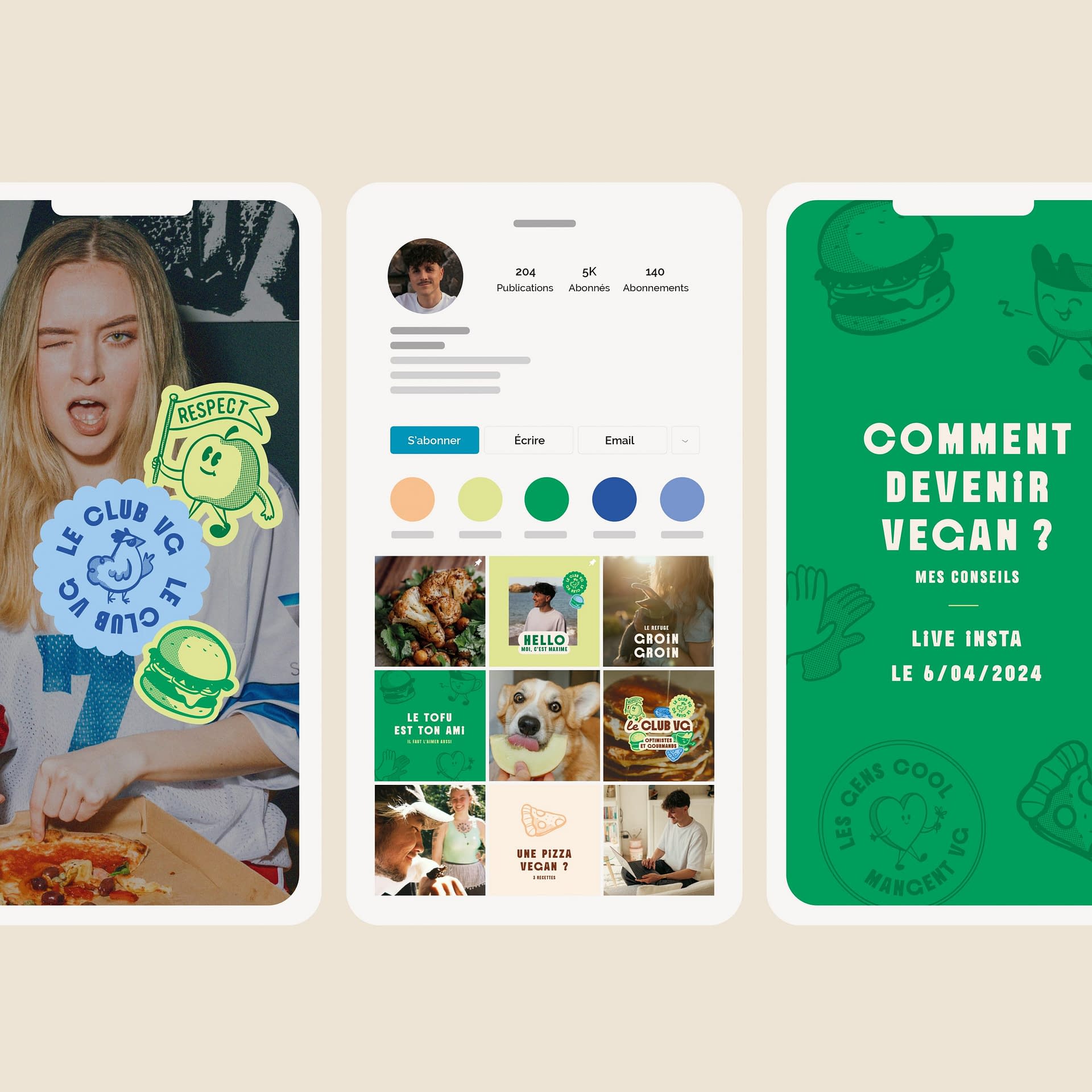 Je propose à mon client une identité visuelle colorée, décalée et très dynamique. L’idée étant de nous éloigner des clichés pesants sur la nourriture végétale (fade, uniquement « healthy », pas conviviale…) et de proposer une réalité de plus en plus partagée par les vegans et végé : celle d’une cuisine bienfaisante, gourmande et savoureuse.